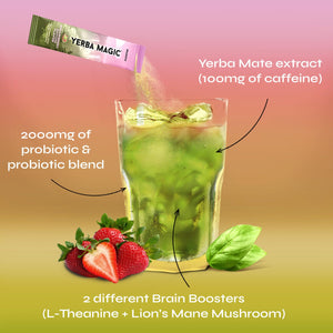 Unlock clean energy, sharp focus, and gut health in one refreshing sip with Yerba Magic. This next-gen adaptogenic tea mix blends yerba mate with powerful wellness ingredients for a functional drink that actually tastes good. With a gut-loving combo of prebiotics and probiotics, Yerba Magic helps ease bloating and support digestive balance. Lion’s Mane mushroom fuels brain clarity and mental performance, making it the perfect daily upgrade for body and mind.